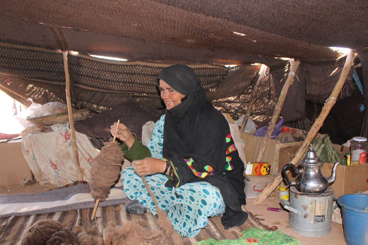 The Berber nomadic family we visited live in the Sahara desert in a tent made of camel hair. We watched while the mother cleaned and spun the camel hair into tread to be used to make clothes and even the roof over their heads. The carmel hair tent keeps it about 20 degrees cooler inside than it is outside – – which in the summer can reach 130 degrees fahrenheit – – and warm during the cold desert nights. (it can get down to 30 degess fahrenheit at night).